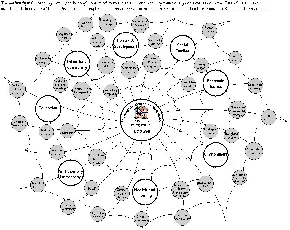 working together and supporting one another. Become involved! Join us every Monday night at 6:00 pm for a potluck dinner (or bar-b-ques during the nice summer weather), followed at 7:00 by a general conversation: "What's on your mind, Bellingham?" Let's network together to become the change we want to see in the world! Besides the following synopsis of this project, and an example of how ECO Bell will locally address a global issue such as climate change, you can also see our web diagram of the nodes and their interconnections that we concern ourselves with, a glossary of terms and definitions from the web diagram, and our complete vision and mission statement. IntroductionWhat will it take for everyone in a community to lead healthy, fulfilling, enjoyable lives? How can we experience personal abundance while ensuring a thriving, healthy planet for ourselves and our posterity? How can we live in peace, both within ourselves and with our neighbors--across the street, and across the ocean? The key to global transformations in the personal, social, environmental, economic, and other realms is not simply a matter of right or wrong actions. Rather, it is a matter of building right relationships--and the ultimate model of right relationships is Nature, whose attraction relationships create and sustain everything in the universe in a perfectly balanced and sustainable "whole systems design." What We're All AboutThe essence of Attraction Retreat is right relationship. As an expression of that, we are embarking on a major project which we've named the EcoIntegrity Center of Bellingham, or ECO Bell for short. Our name is a combination of the words ecology--the study of systems and the interdependent relationships among all forms of life and their environment--and integrity, which is soundness, completeness, and an adherence to a code of values. The ecointegrity center blends ecology and integrity by embracing and expressing the core values of the Earth Charter: respect and care for the community of life, ecological integrity, social and economic justice, democracy, nonviolence, and peace. We go beyond merely philosophizing about these values and the issues they are related to by actively demonstrating how people can live healthy, fulfilling lives while creating right livelihood through an adherence to an ethic of ecointegrity. ECO Bell is a budding intentional community for activists, change agents, and concerned, caring citizens working in the areas of ecological integrity, social justice, participatory democracy, and economic equity. We support one another as, together, we address the interdependent relationships among these areas and demonstrate how cross-disciplinary cooperation and reciprocity can help create healthy communities built with vibrant neighborhoods comprised of individuals who care about each other as much as they care about our natural environment. A major impetus in the development of the vision and mission of ECO Bell was our desire for it to be much more than just an intellectual exercise, or a theoretical set of scenarios composed of "what-ifs" and "maybes." The articulation of the problems in current cities, neighborhoods, social structures, economic systems, the underlying environment they all rely upon, and how these all can negatively impact people, is readily available in numerous places. However, the solutions tend to be somewhat scattered. There are many good individual ideas in many areas, but few attempts to address them in a cohesive, systematic, and systemic manner. At many of the simplicity, sustainability, justice, and environmental conferences we've attended lately, there is always much talk about what the problems are, and their negative effects on people, society, and the environment. The main question everyone in attendance keeps repeating, though, is "what can we do?" and the few answers tend to be rather abstract at best, beyond the common "recycle more and drive less." ECO Bell does not purport to contain all the solutions, or provide solutions that will work best for everyone in every location. What we intend to actually do, however, is demonstrate through a functional, working model how a number of solutions can be brought to bear in a manner such that the cumulative effect can have wide-reaching ramifications throughout the entire system. Using the best available tools in scientific research, we will address these issues mainly from the viewpoint of the relationships between the issues. Instead of using the common method of addressing each issue in isolation, and falling prey to what may be called the reductionist's fallacy, we will look at how these issues relate to and affect one another--reflecting the interconnected and interdependent nature of reality. One of the issues in sustainable urban design is the problem of how to increase density and decrease sprawl. We intend to show how urban neighborhoods can help solve this dilemma while maintaining their unique characteristics (and characters) and without increasing congestion--either the human or the vehicular type. One of the requirements for a healthy and sustainable community is diversity. Every healthy ecosystem demonstrates this inescapable fact. When it comes to economic diversity, the other side of that coin is autonomy and as much independence as possible from outside forces. It is our belief that communities can increase both density and diversity, and in doing so, become less dependent on fossil fuel transportation. Communities also decrease the resources they consume, which will automatically lower the environmental impact on their bioregion. How We Intend To DO SomethingSome of the initial aspects and issues the ECO Bell project will be addressing include:
